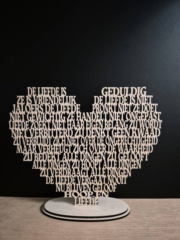 De bekende woorden uit 1 Korinthe 13, de Nederlandse tekst, uitgesneden in de vorm van een hart.