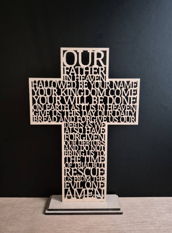 De Engelstalige versie van 'Het onze Vader', uitgesneden in de vorm van een kruis.