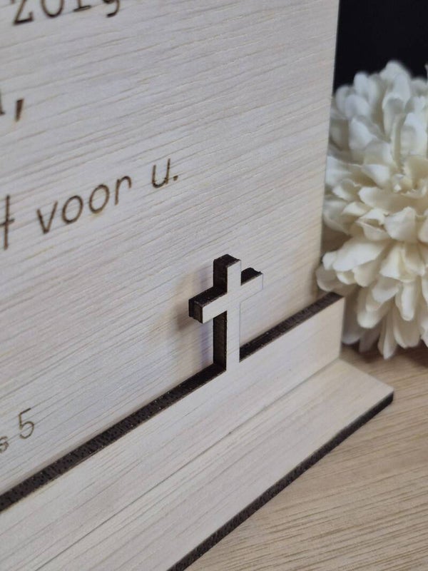 Staand houten tekstbord met de tekst uit 1 Petrus 5 vers 7.