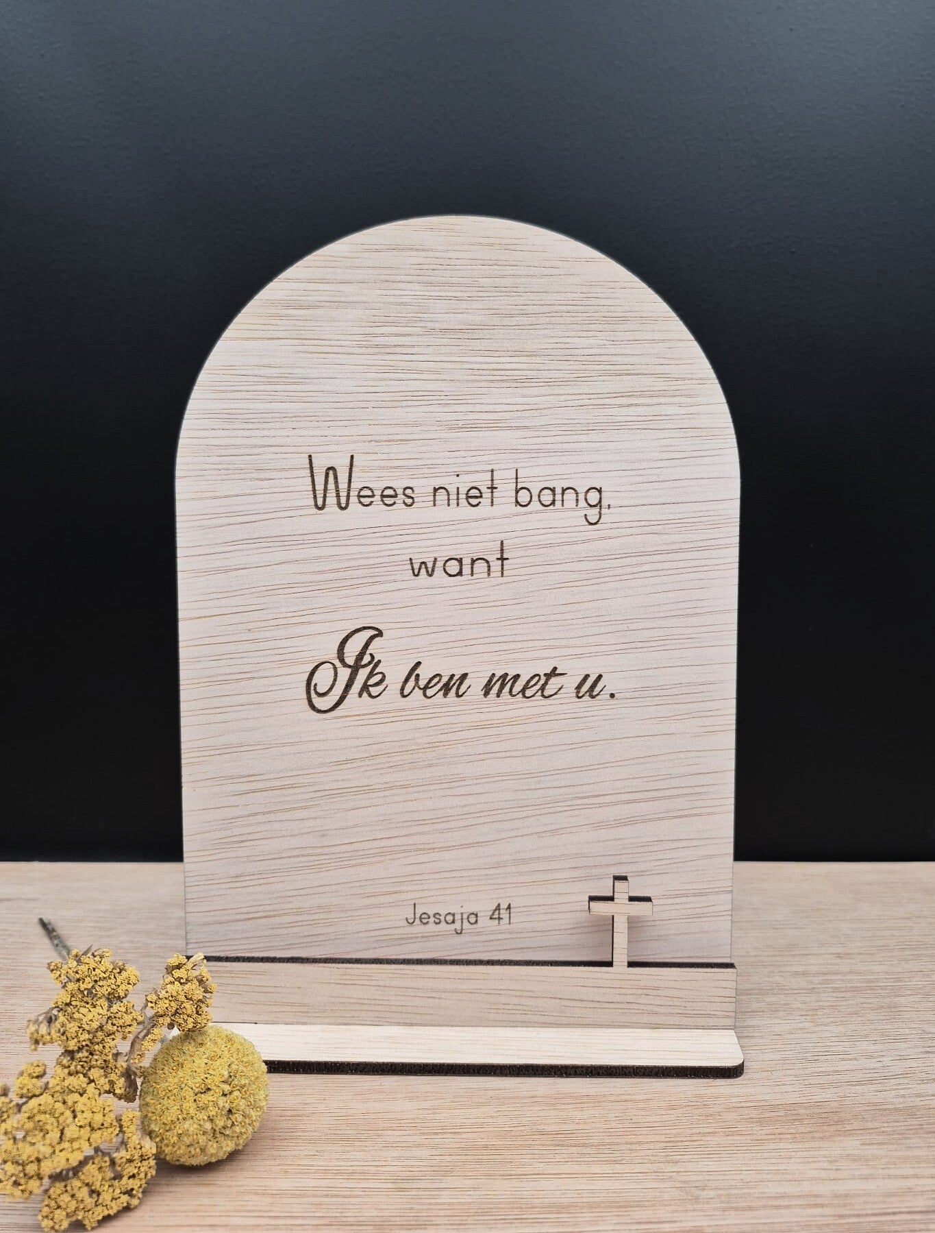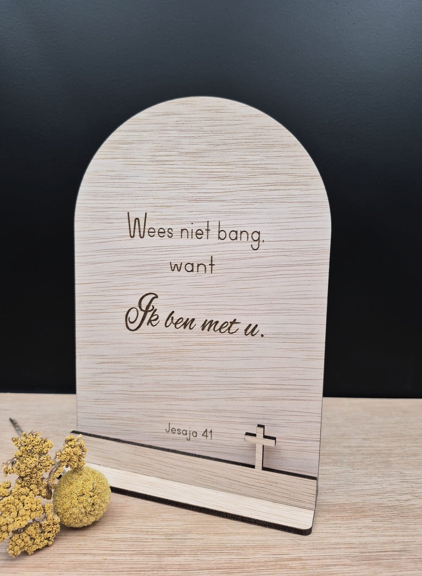 Staand houten tekstbord met de tekst uit Jesaja 41