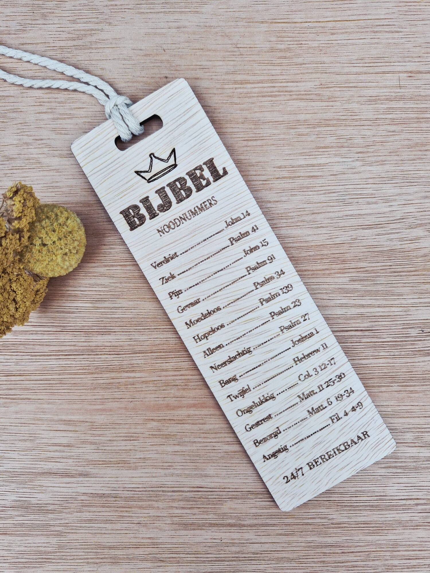 Op de bladwijzer staat een overzicht van 'noodnummers'; teksten die passen bij verschillende momenten in het leven.